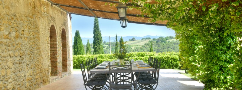 Der wunderbaren überdachten Terrasse der Villa ist, wie bereits erwähnt, ein 5x10 m großer Pool vorgelagert, der auch beheizbar ist. Von hier aus geniest man einen wundervollen Blick über eine unverfälschte, intakte Natur über die Hügellandschaft dieser Region an der ligurischen Küste. Weite Felder und Waldabschnitte wechseln einander ab und gestalten ein wunderschönes, erholsames, sommerliches Panorama.